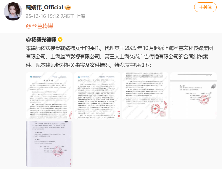 12月15日,鞠婧祎方发声明,称与丝芭传媒的经纪合约已于2024年6月终止,同时指控丝芭传媒伪造艺人签名及授权。16日,丝芭传媒晒笔迹鉴定报告否认伪造艺人签名及授权。对此,鞠婧祎方也请律师发布了相关声明。