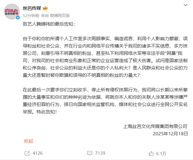 12月18日,丝芭传媒再度发文:致艺人鞠婧祎的最后告知。在此最后一次要求你们立刻收手,停止所有侵权抹黑行为,我司将以长期以来所掌握的大量事实和你们的种种劣迹为依据,将就你本人和你的关联人涂某某等涉嫌严重经济犯罪的行为,择日向国家相关监管机构,媒体和社会公众进行全网公开实名举报。特此告知!