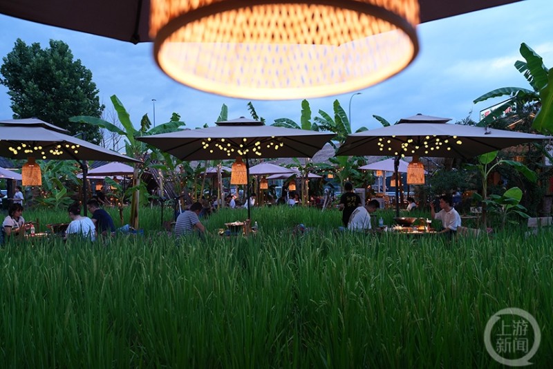 当地商家“别出心裁”将水稻栽种在户外的餐厅里,吸引众多游客前来打卡消费。