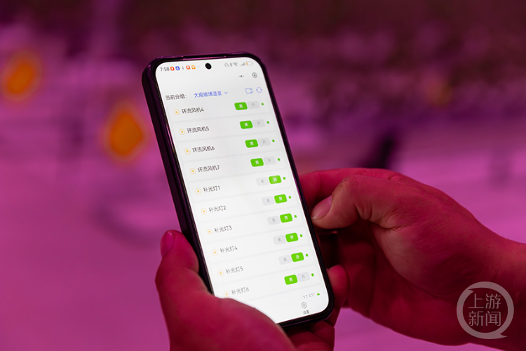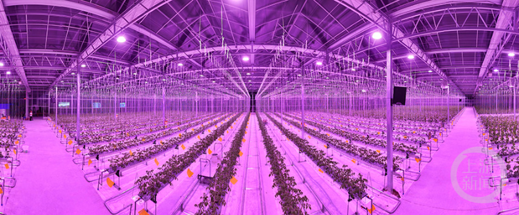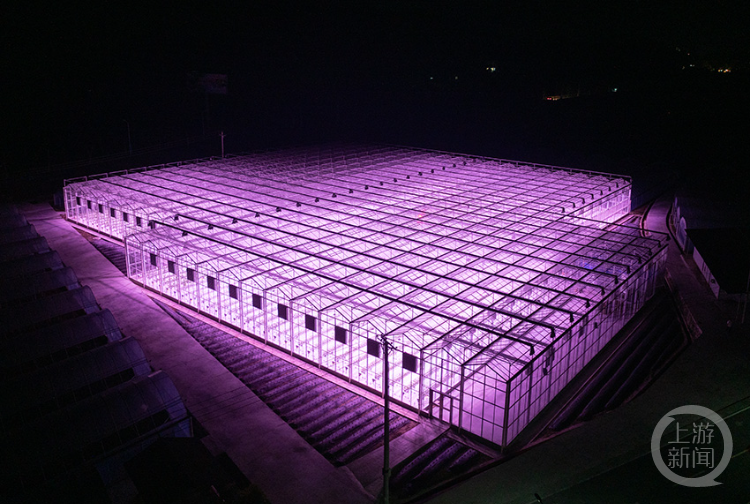 夜幕降临后,丝瓜智慧工厂又呈现出另一番景象。682盏LED补光灯同时亮起,绚烂的紫光将玻璃幕墙建筑幻化为科幻感十足的“瓜立方”。