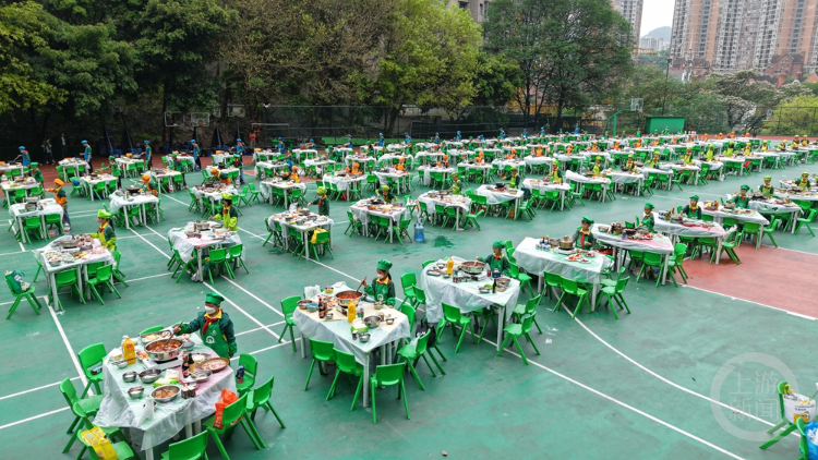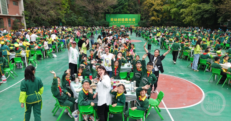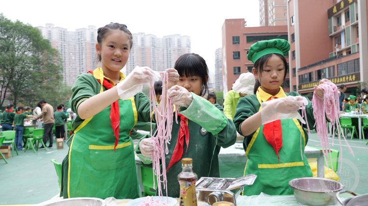4月25日,重庆市沙坪坝区某小学的操场上,1747名学生以匠心巧思烹制175桌重庆火锅与重庆小面千人宴,红油翻滚的火锅氤氲着巴渝烟火气,七彩小面盘结出山城诗意,每一桌成果都凝聚着学生对劳动技能的传承与创新、对家乡的热爱。