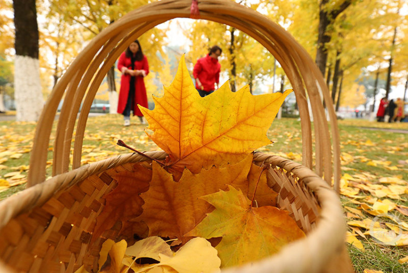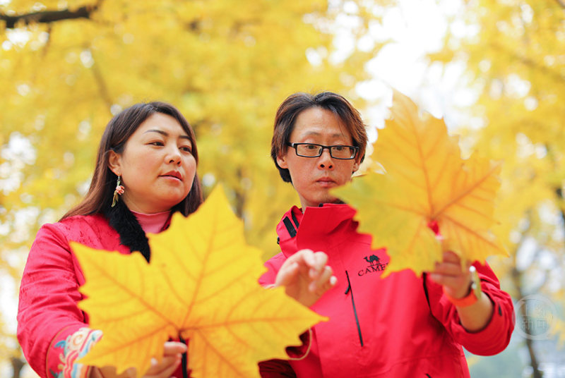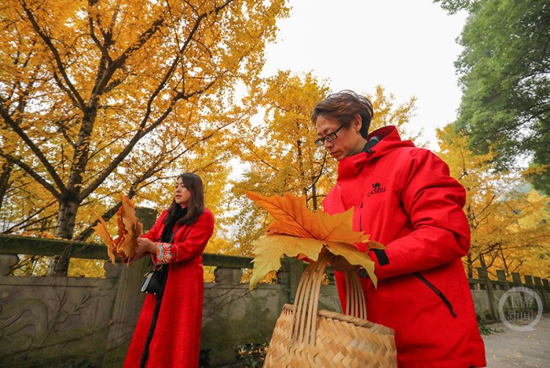 钱力夫妻正在捡落叶。每年的这个季节,他们都会捡拾近一万片落叶,在接下来的几个月进行叶雕创作。