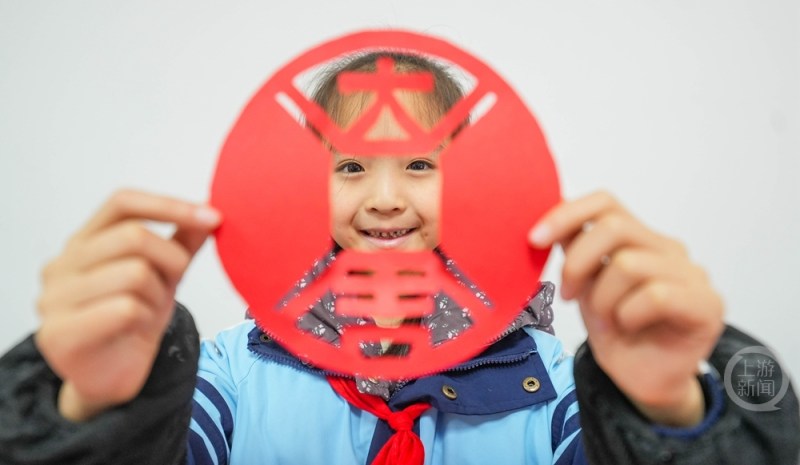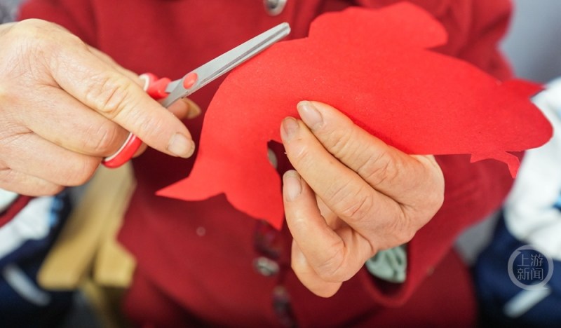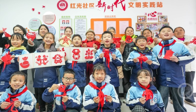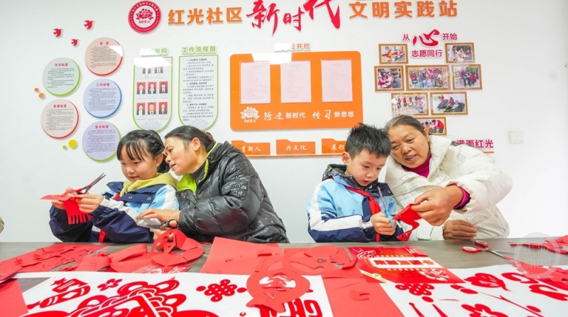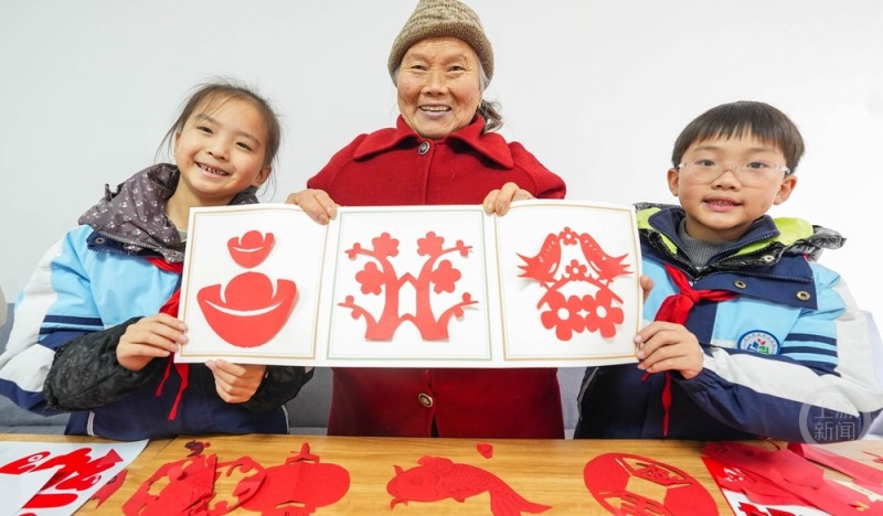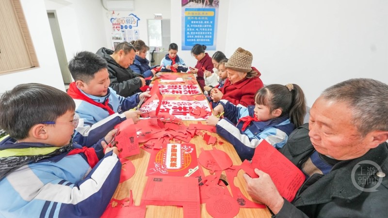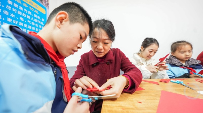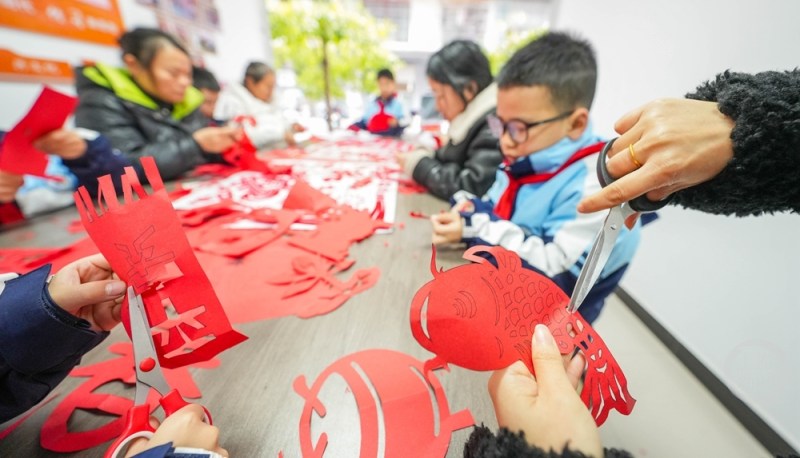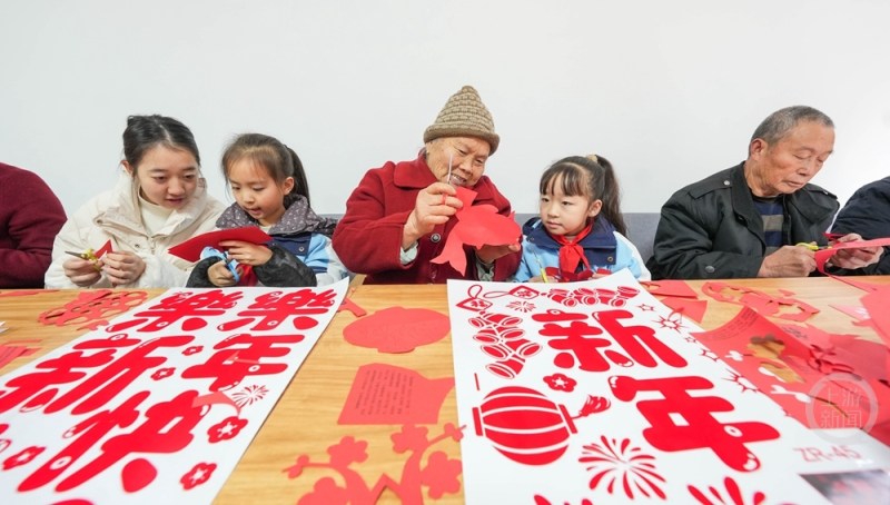12月26日,重庆市垫江县,小学生、学生家长与社区老人一起剪纸迎接元旦节,一派其乐融融的喜庆氛围。