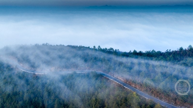 1月11日清晨,重庆市酉阳土家族苗族自治县丁市镇岩门底云端公路,平流雾如纱幔般漫过蜿蜒山道,公路似银龙般穿梭云海。