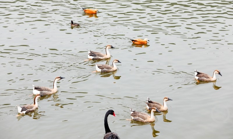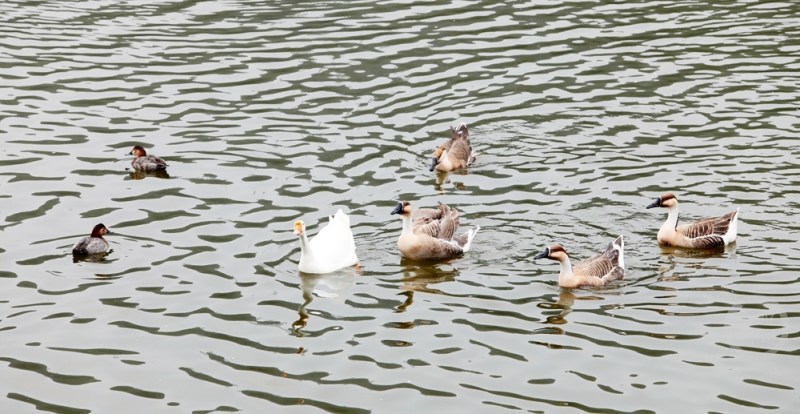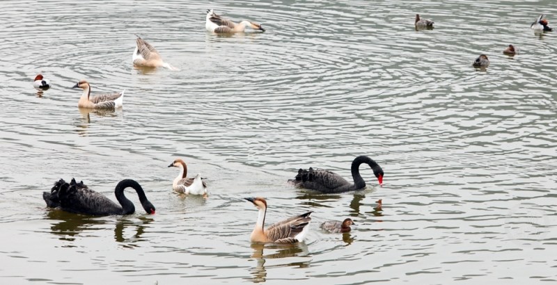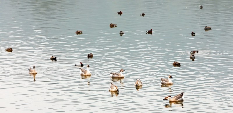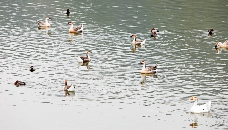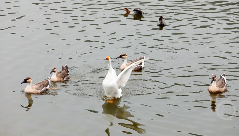 1月11日,重庆市永川区某动物主题乐园水禽湖,不少从北方迁徙而来的赤膀鸭、红头潜鸭、小鸊鷉等候鸟前来“安窝”,与当地的疣鼻天鹅、赤麻鸭等300余只鸟类汇聚于此。