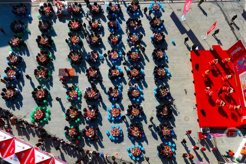 1月11日,重庆市黔江区,游客们在第二届武陵黑猪乡村文化节上体验土家刨汤宴。