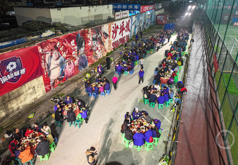 赛后在球场旁举行的坝坝宴,球员和球迷共同庆祝晋级。