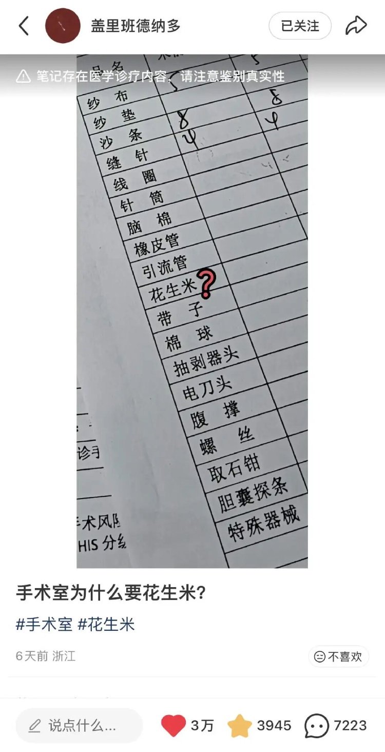 最近,一张手术室的器材清单引发了网友们的热议。在纱布、针筒、棉球、引流管等一众“正经”的手术器材中,居然出现了花生米。