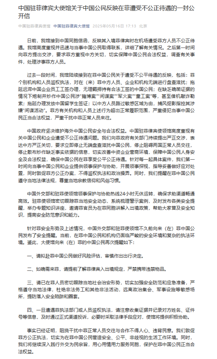 5月16日,中国驻菲律宾大使馆发布关于中国公民反映在菲遭受不公正待遇的公开信。内容如下: