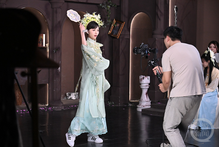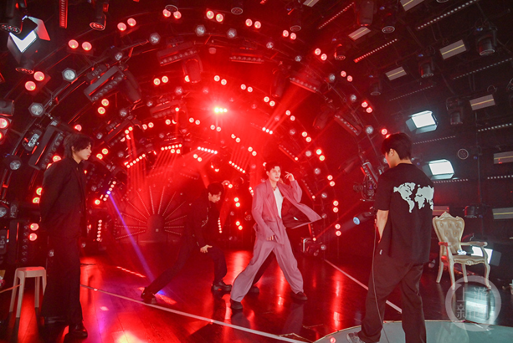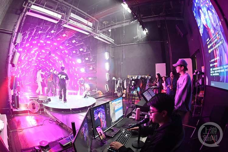 在多功能直播间,网络主播正在进行舞蹈表演。
