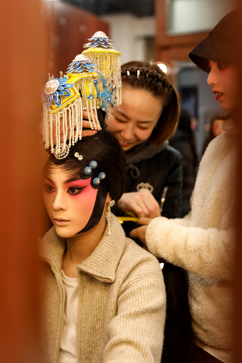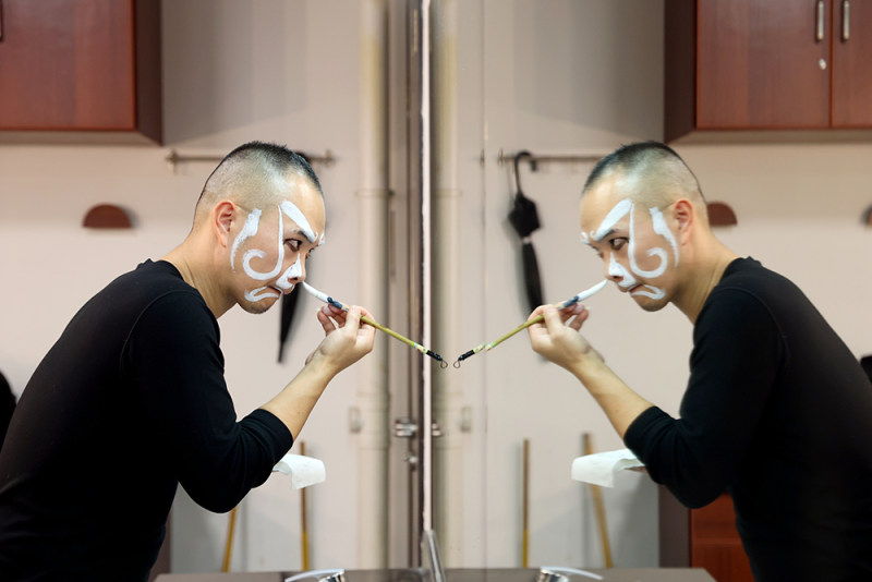 2025年12月,重庆市川剧院,戏曲演员在幕后化妆。