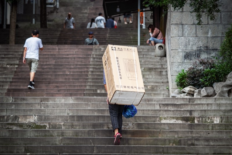 《负重前行》。2025年6月18日,摄于重庆市渝中区菜园坝建新坡