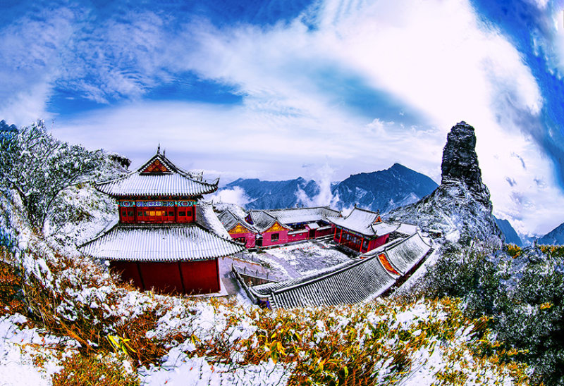 《梵净仙境》2025年1月,贵州省铜仁市梵净山,冬雪覆盖下的庙宇、孤山与晴朗的天空仿佛构成了人间仙境。