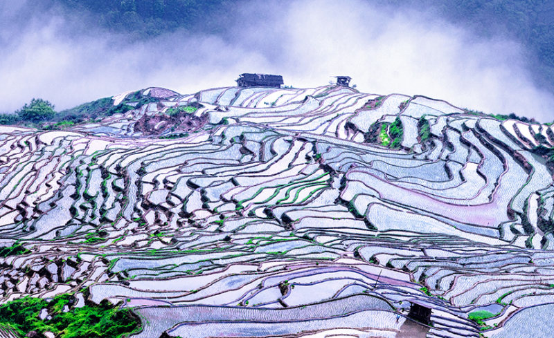 《山中一幅画》2025年5月,广西壮族自治区桂林市龙胜各族自治县龙脊梯田。雨后天晴,云漫远山,梯田泛光,构成和谐的山村画卷。