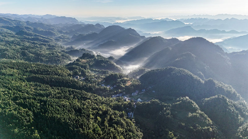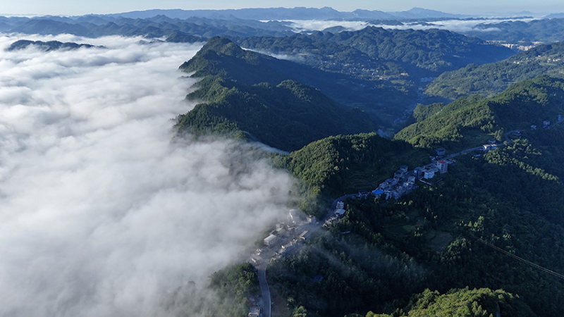 2025年8月26日清晨,重庆市酉阳土家族苗族自治县木叶乡干田村,层峦叠嶂的山脉、缭绕的云雾与灿烂的阳光相互交融,勾勒出如诗如画的自然胜景,绘就水墨山水长卷。