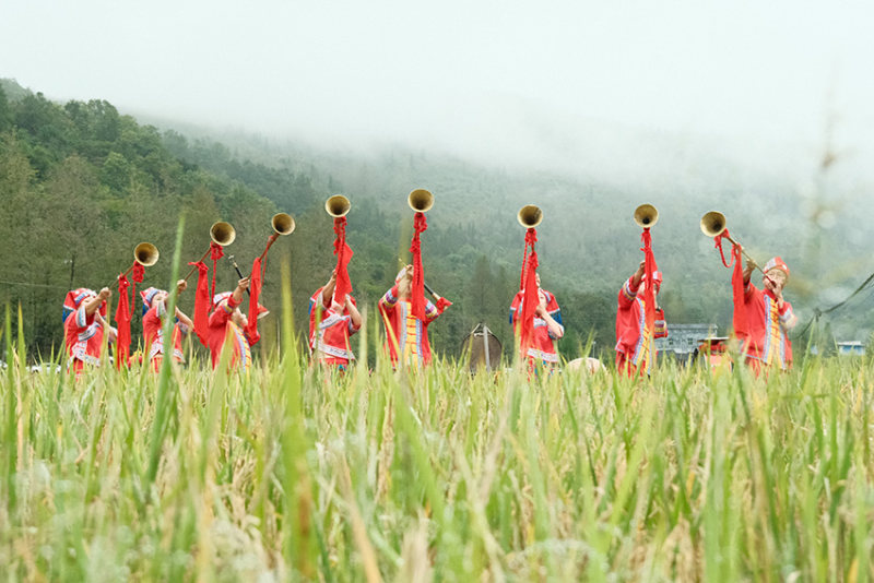 2025年9月19日,重庆市酉阳县圆梁山片区(腴地乡)首届丰收嘉年华启幕。在牧野逐欢活动中,稻田里,穿着民族服饰的群众,奏响丰收欢歌。