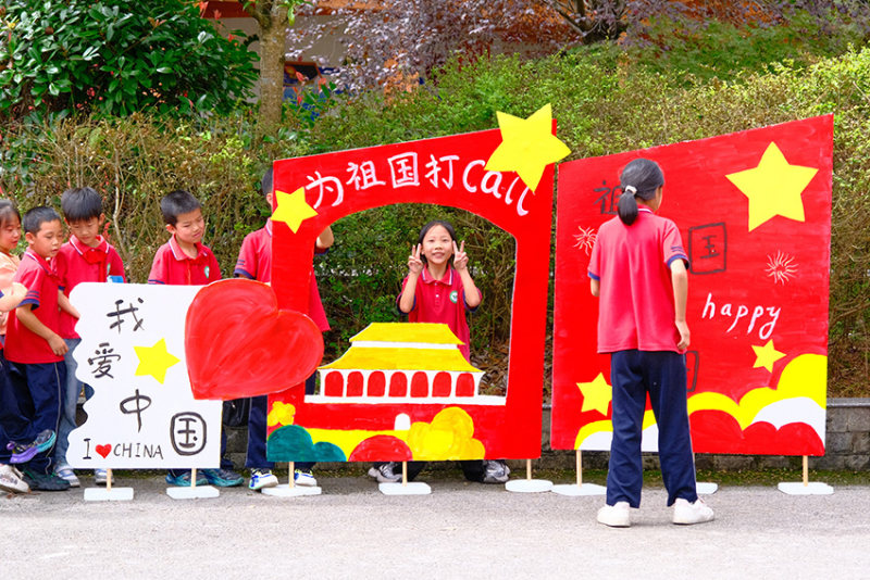 2025年9月29日,在重庆市酉阳土家族苗族自治县木叶乡,小学生们纷纷与手工作品同框打卡留念,共庆祖国生日。