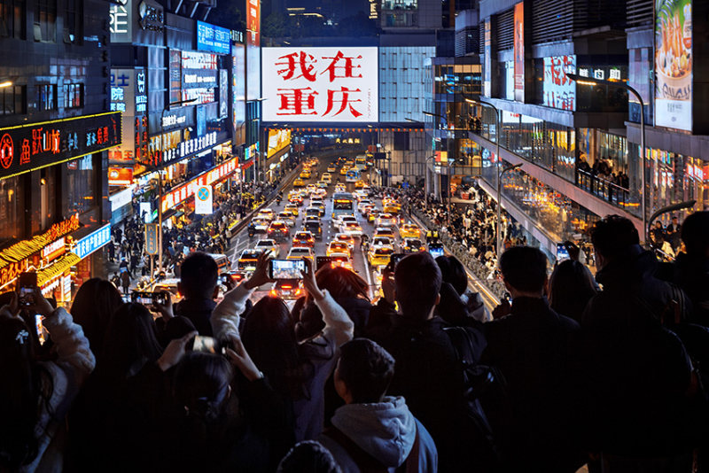 《渝夜追光者》。2025年2月10日,重庆市两江新区观音桥,“我在重庆”的灯牌下,人影如潮。每一部举起的手机,都在收藏这座不夜城的心跳。