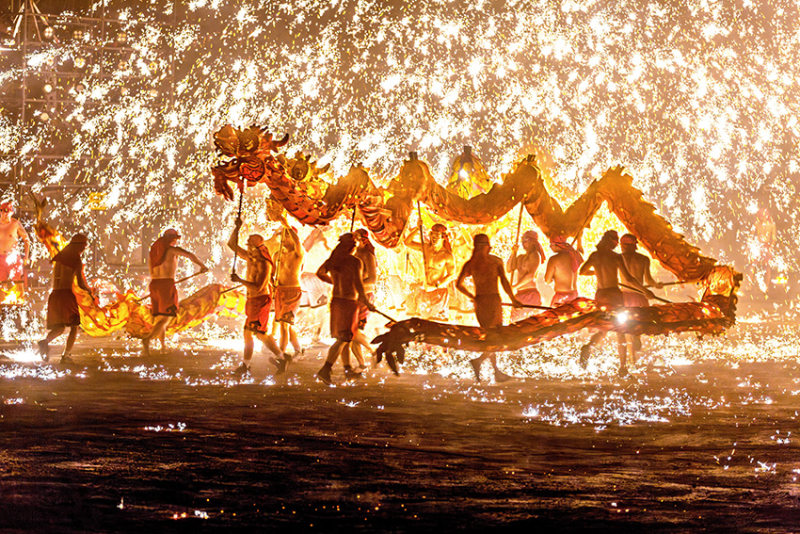 《铁花璀璨舞龙跃》。2025年2月16日,重庆市沙坪坝区,赤膊汉子擎长龙闯入铁花雨,光与火在古铜色脊背上,刻下千年不灭的图腾。