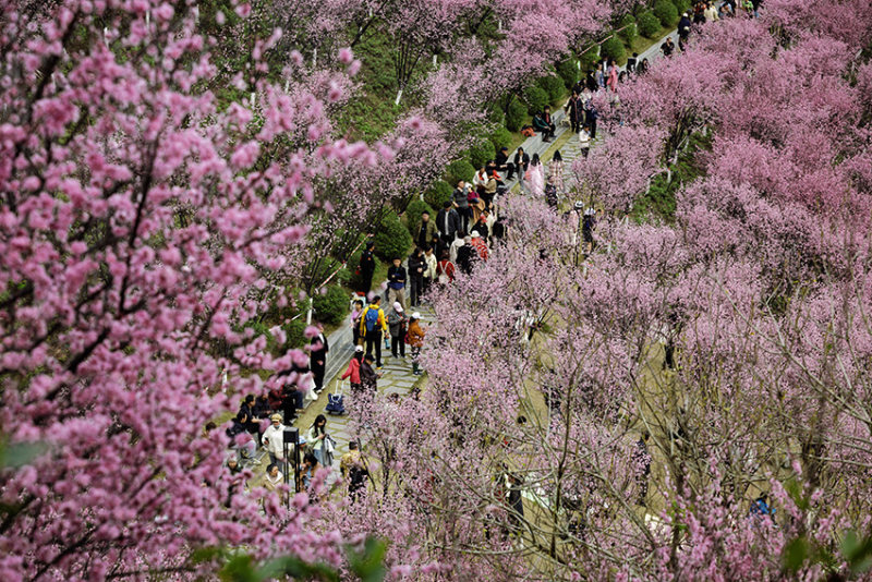《康庄花海:城市中的粉色律动》。2025年2月26日,重庆市两江新区康庄,粉云夹道,游人如织。康庄的这条小径,是春天亲手铺设的浪漫隧道。