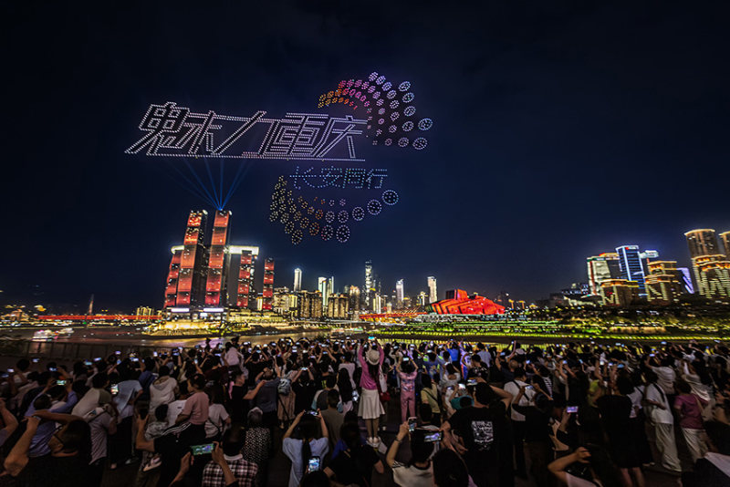 《魅力重庆·长安同行》。2025年5月3日,重庆市南岸区南滨路,千架无人机与万家灯火合奏,为山城谱写了一曲璀璨的夜空交响。