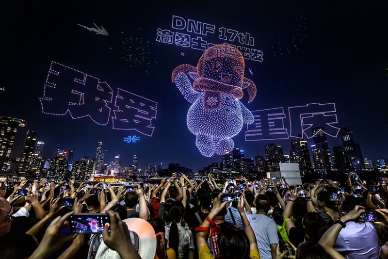 《渝空绘卷》。2025年6月17日,重庆市南岸区南滨路,萌宠“亚蒙”与“我爱重庆”同框,千架无人机以光点作笔,为山城写下情诗。