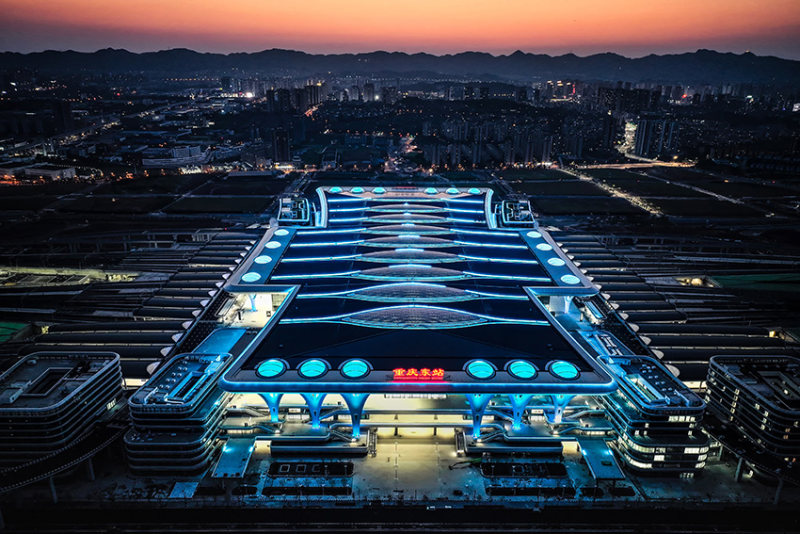 《渝枢新景:重庆东站耀山城》。2025年6月12日,重庆市南岸区广茂大道重庆东站,蓝光勾勒的骨架托起璀璨站台,红色站名如印章,烙在山城柔软的夜色里。