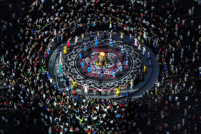 《天上黄水燃情夜》。2025年7月11日,重庆市石柱土家族自治县黄水镇大剧院广场,万人环绕火堆踏歌摆手,彩衣旋成斑斓涡流,将土家的心跳舞成山川的节拍。