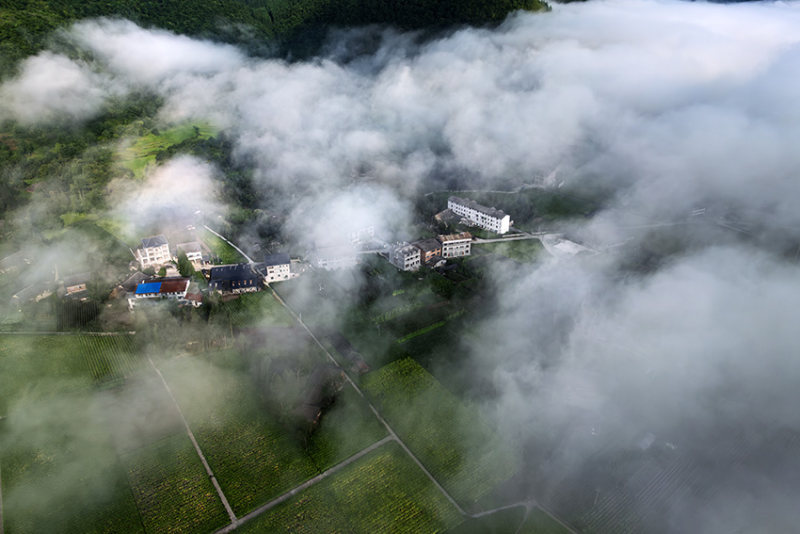 《云栖山居》。2025年7月30日,重庆市丰都县太坪坝,薄雾漫过青瓦绿田,远山层叠如墨。村落安睡其间,绘成一方遗世水墨。