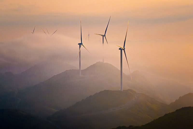 《山脊的诗行》。2025年7月30日,重庆市丰都县太坪坝,白色风机是大地写向天空的诗句,薄雾为它断行。每一转,都在续写可持续发展的篇章。
