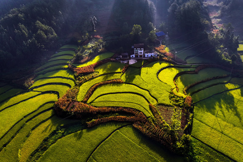 《山居晨韵》。2025年9月1日,重庆市石柱土家族自治县鱼池镇鱼池乡,晨光穿过林隙,为五彩梯田镶上金边。村落静卧其间,似在等一缕炊烟。