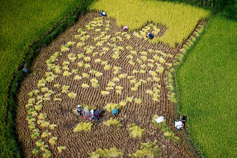 《丰年绘卷》。2025年9月16日,重庆市石柱土家族自治县鱼池镇鱼池村,金黄与翠绿在田野交织,弯腰的身影是画中最生动的笔触,秋光为墨,丰收入卷。