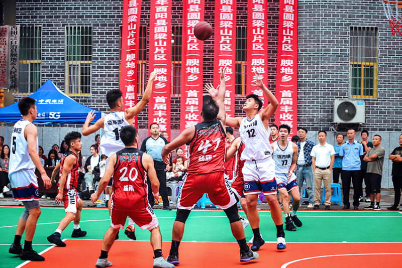 《丰收季的篮板》。2025年9月19日,重庆市酉阳土家族苗族自治县圆梁镇腴地乡,球员在横幅下跃起拼抢,每一次争球,都带着泥土与汗水的气息。