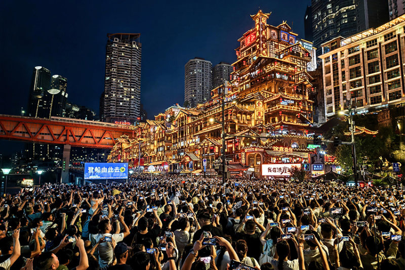《洪崖洞:夜灯下的人潮磁场》。2025年10月3日,重庆市渝中区洪崖洞,暖黄灯火吻亮特色吊脚楼,镜头后的眼都沉醉在这场永不散场的光影盛宴。
