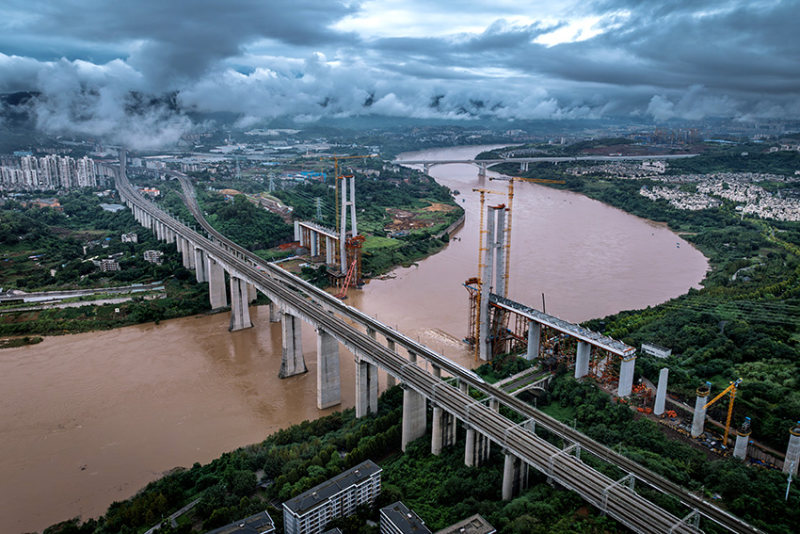 《嘉陵筑梦》。2025年10月4日,重庆两江新区,在山水与城市之间,钢铁的骨架正勾勒未来。塔吊是笔,绘出跨越天堑的蓝图。