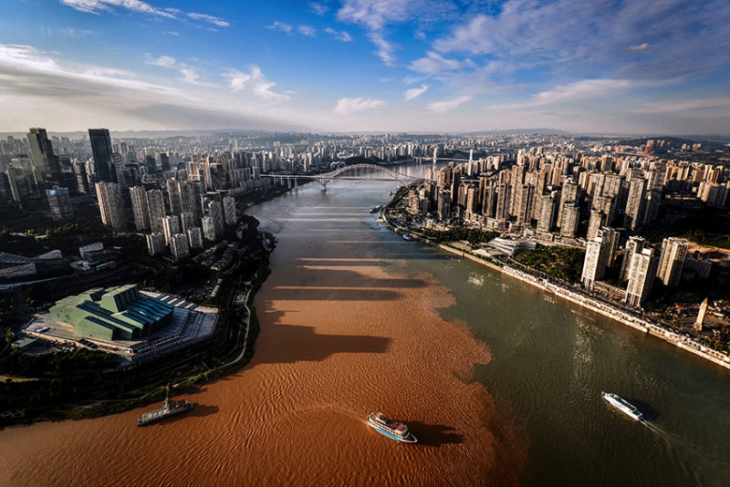 《两江调色盘》。2025年10月8日,重庆市渝中区来福士,一清一浊,一急一缓,在朝天门前交织出巨大漩涡。这是城市的心跳,亦是山河的呼吸。