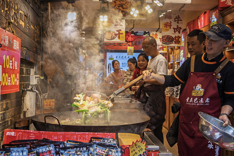 《烟火气里的重庆味》。2025年11月13日,重庆市沙坪坝区磁器口,“巴适老”的红围裙是旗号,一锅沸腾的红油便是江湖,香气是无声的吆喝,在“欢庆佳日”的包围中招揽四方来客。