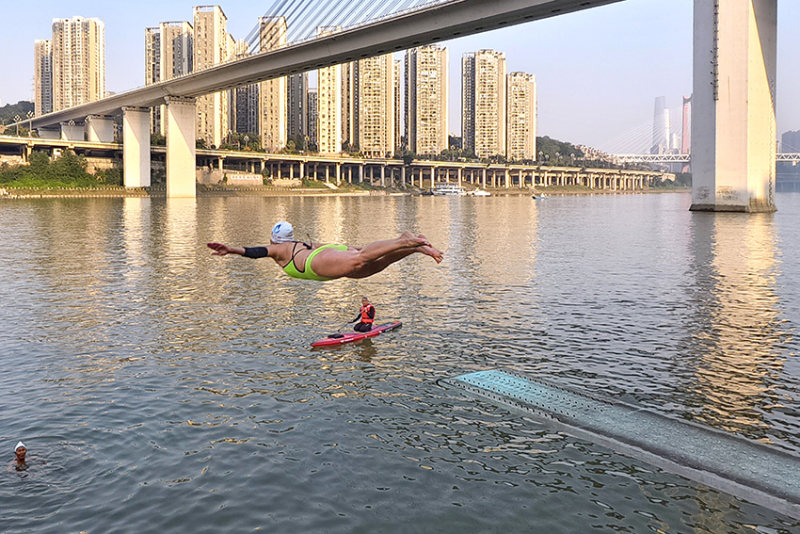 《凌波一跃》。2025年11月28日,重庆市沙坪坝区汉渝路江边,在石门大桥的注视下,他舒展如燕,将冬日的江面点燃成一幅动感的画卷。