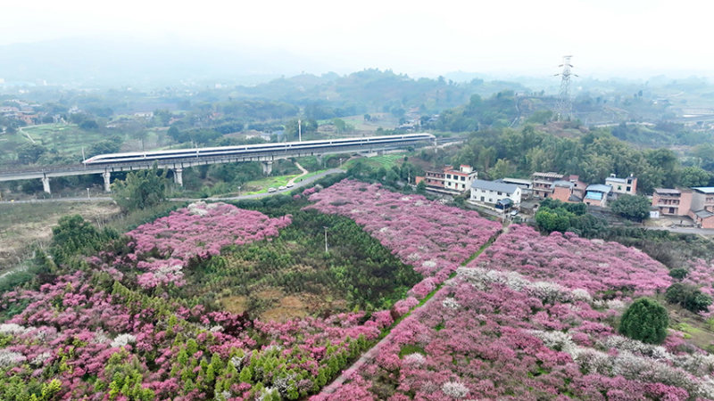 2025年2月13日,成渝高铁列车穿行在重庆市永川区大安街道德胜桥村梅花花海中,一路疾驰,恍若从花海间“开往春天的列车”。