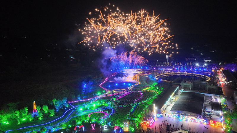 2025年5月4日晚,重庆市永川区南大街街道十里荷香农业园区,众多游客兴奋地欣赏打铁水、烟花秀以及参与篝火晚会等活动,感受花火与音乐互动交融的视觉盛宴。
