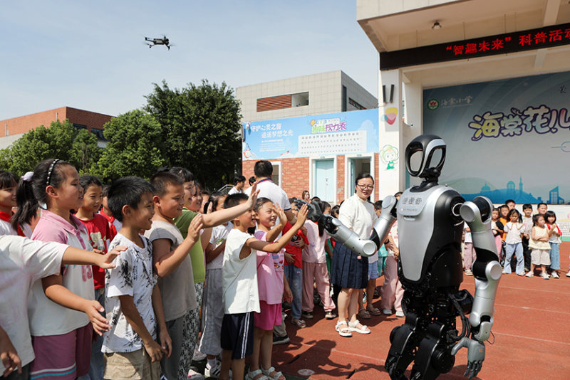 2025年9月16日,重庆市永川区,小学生们与AI人形机器人进行互动,孩子们通过沉浸式、互动式的实践体验,近距离感受到人工智能技术的魅力。
