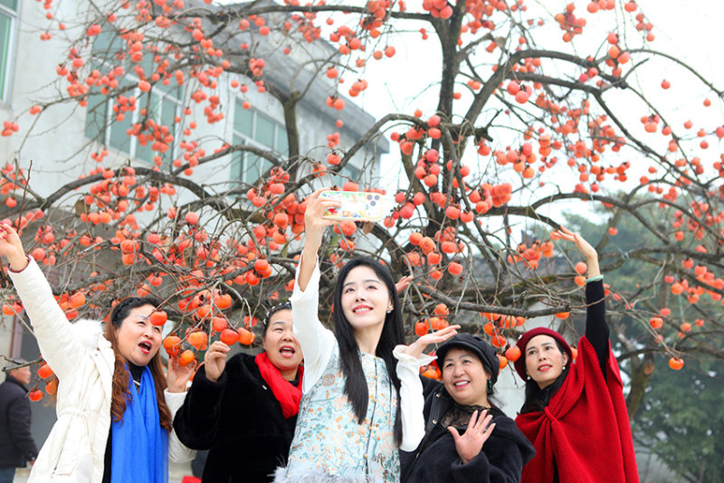 2025年12月9日,不少市民和游客在重庆市永川区南大街街道黄瓜山村一村民院坝的柿子树前拍照打卡,感受丰收的喜悦。