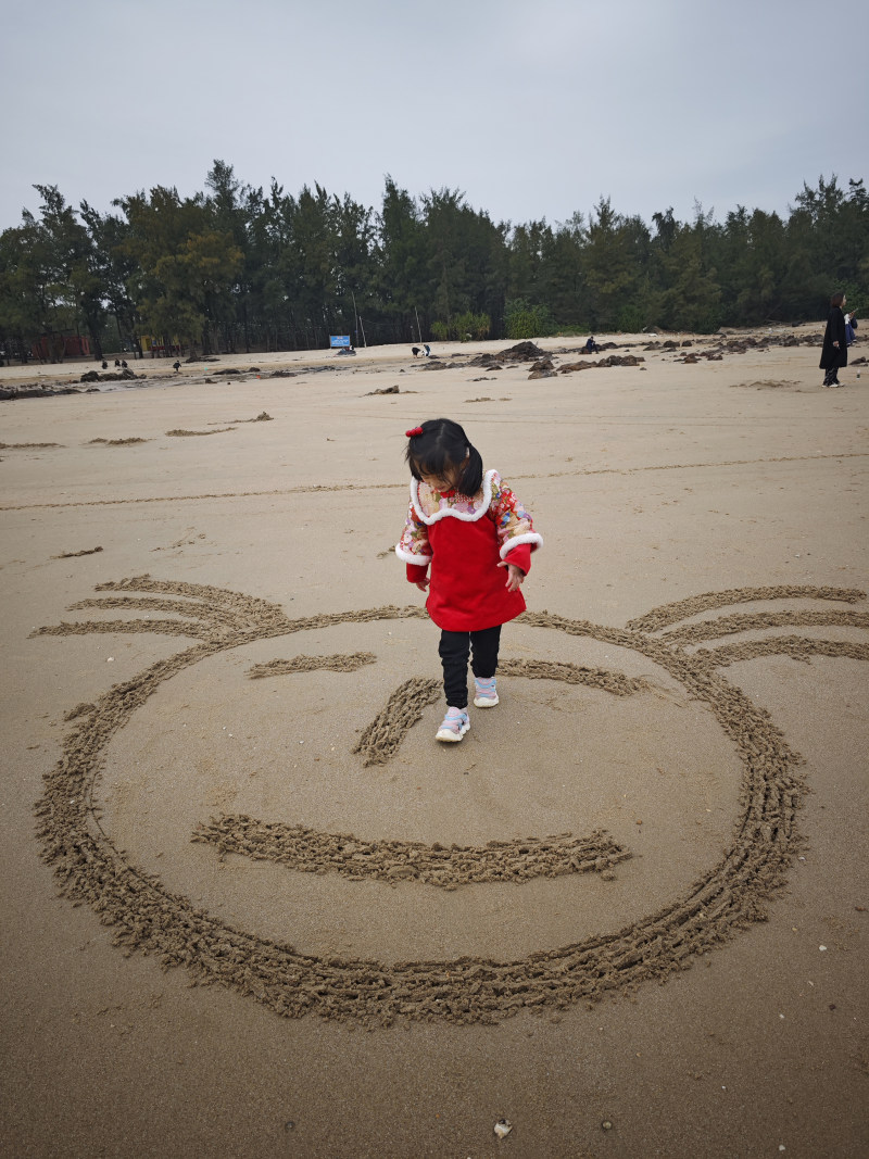 2025年2月4日,广西北部湾沙滩上,小朋友用小铲画出大大的笑脸。