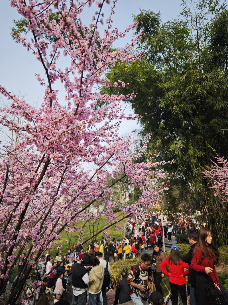 2025年3月1日,重庆市渝中区关帝庙的美人梅迎春盛放,吸引众多市民游客前来打卡。
