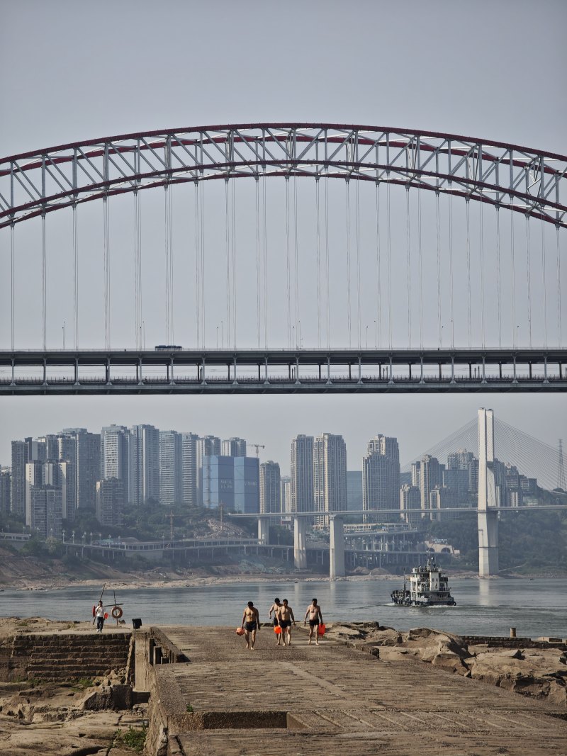 2025年5月1日,重庆两江新区江北嘴江畔,几名游泳爱好者正从江中上岸。
