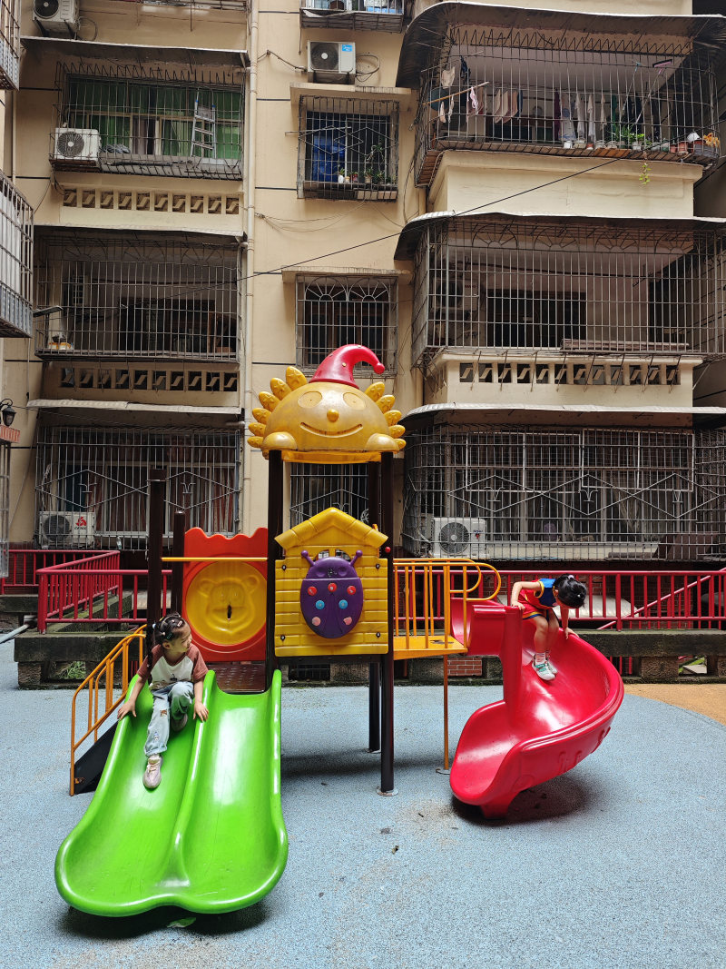 2025年6月7日,重庆市渝中区枣子岚桠社区新添了一座滑滑梯,两位小朋友正开心地在此玩耍。