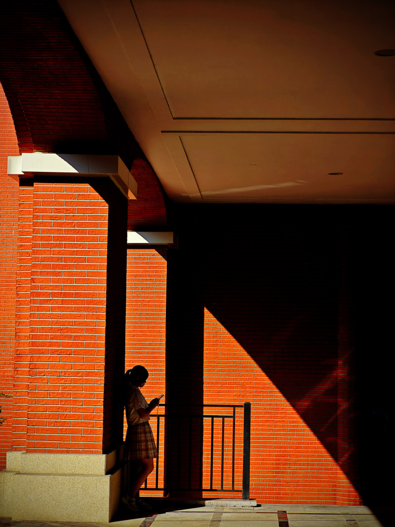 2025年6月27日,重庆市江津区党校,一位学员静立于墙角浏览手机,于光影交织间勾勒出鲜明的剪影。