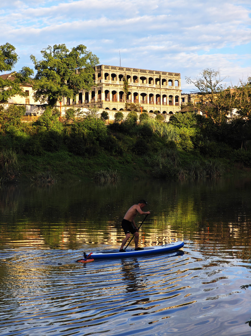 2025年7月24日,重庆市江津区,浆板爱好者在落日余晖映照下的马家洋楼前玩浆板。
