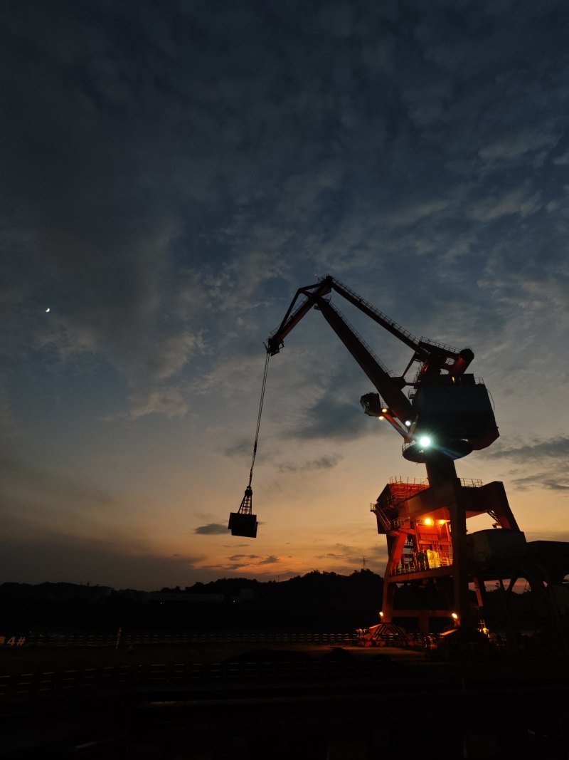 2025年7月30日,重庆珞璜港作业区,黄昏时分,一台高大的带斗门机在码头前沿静默矗立,其剪影与天际线相融。