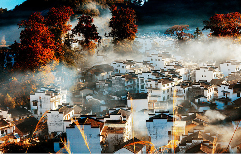 《秋叶晨雾》2025年11月,摄于江西省上饶市婺源县。